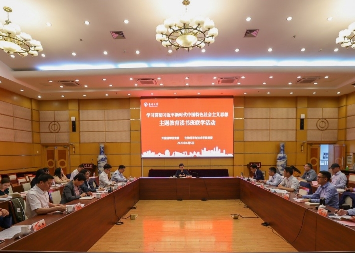 6月5日,外国语学院、生物科学与技术学院党委理论学习中心组举行学习贯彻习近平新时代中国特色社会主义思想主题教育读书班联学活动。副校长蔡颖蔚到会巡学旁听并讲话。