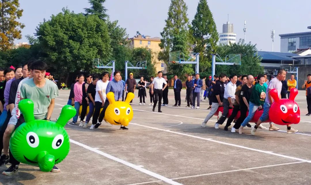 本次趣味运动会设摸石头过河、毛毛虫竞速、众星捧月、抢收抢种、赶篮球跑接力、打保龄球、篮球定点投篮、毽子踢准和拔河等9个运动项目。