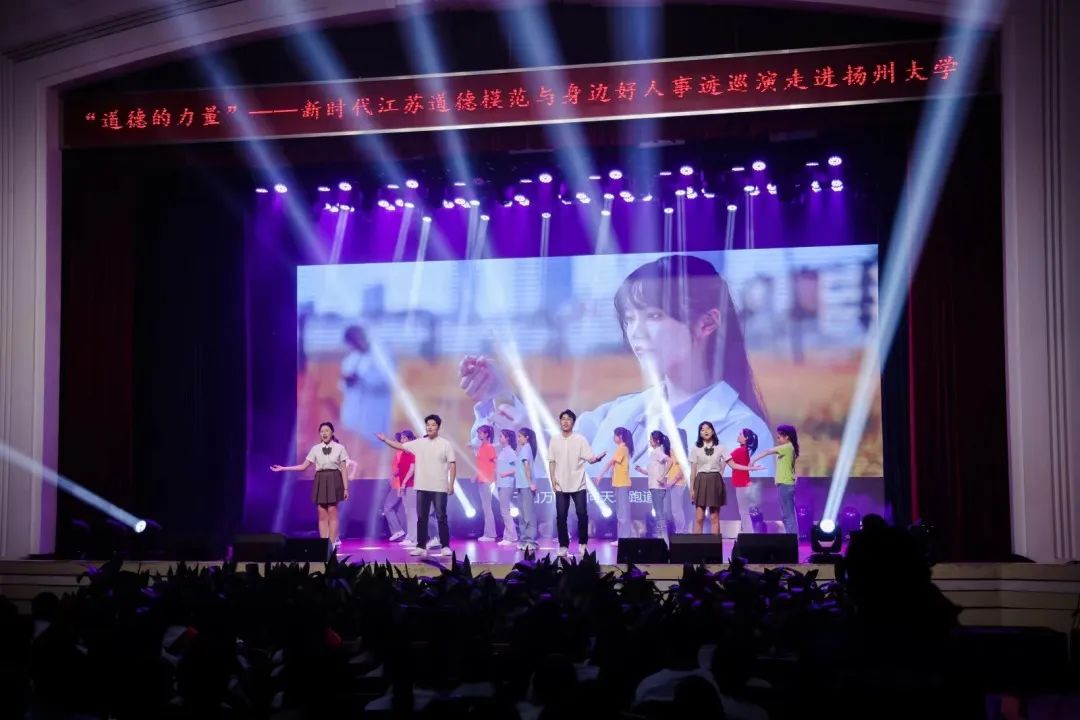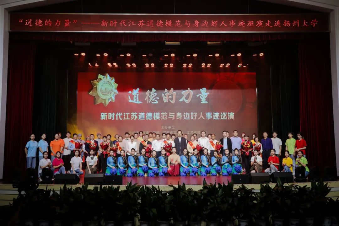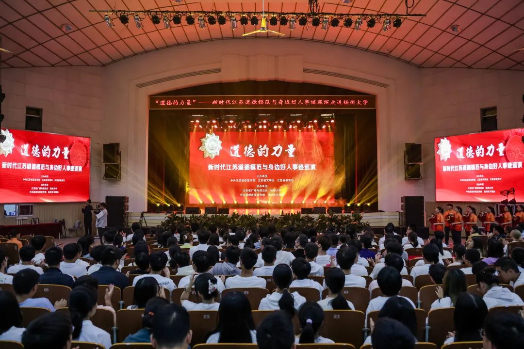 10月18日,由江苏省委宣传部、省文明办、省教育厅主办,省广播电视总台、扬州大学、扬州市委宣传部、扬州市文明办联合承办的“道德的力量”——新时代江苏道德模范与身边好人事迹巡演活动在我校文汇路校区大礼堂举办。校党委副书记周如军,市委宣传部副部长、市文明办主任吴军,省广电总台城市频道副总监周晓萌等出席活动。