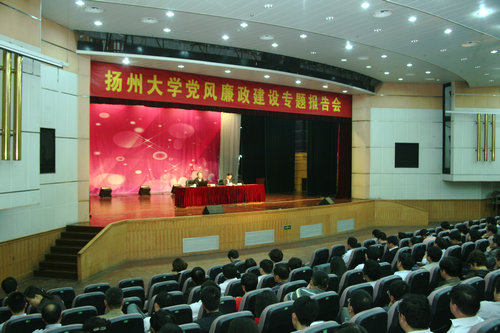 5月14日下午,学校在荷花池校区大学生活动中心小剧场举行党风廉政建设专题报告会。中共扬州市委常委、纪委书记张跃进应邀来校作专题报告。校党委书记夏锦文主持报告会并讲话。校党委副书记、纪委书记刘延庆出席报告会。