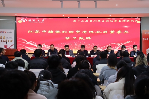 近日,第十三届贵州茅台奖助学金颁奖典礼在扬子津校区举行。副校长蒋乃华,贵州茅台酒销售有限公司江苏省区经理龚艺桂,江苏中糖德和经贸有限公司董事长、我校校友张卫出席仪式并讲话。江苏中糖德和经贸有限公司总经理李朝阳,扬州风正经贸有限公司董事长徐谨,南京裕佰鑫百货贸易有限公司总经理薛达等出席仪式。