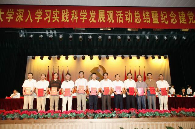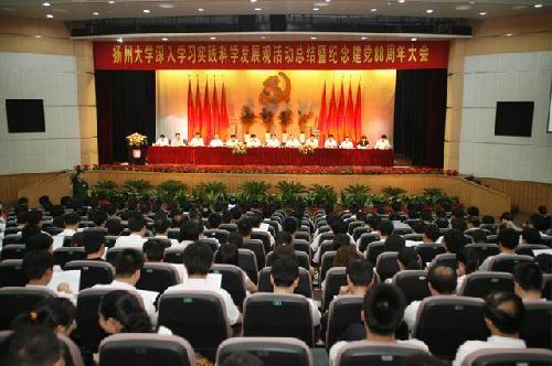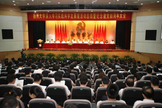 下午,学校隆重举行深入学习实践科学发展观活动总结暨庆祝建党88周年大会,对学习实践活动进行总结,对今后一段时间工作进行部署,同时表彰了2007-2009年度先进基层党组织、优秀共产党员和优秀党务工作者。校党委书记陈章龙讲话,校长郭荣主持大会。省教育厅副巡视员步锦昆,省高校第九指导检查组副组长、教育厅师资处处长樊增荣出席大会。校党委副书记刘延庆宣读表彰决定,校党委副书记、副校长芮鸿岩宣布“党员爱心基金”募集及“七一”慰问困难党员工作情况,全体在扬校领导出席大会。