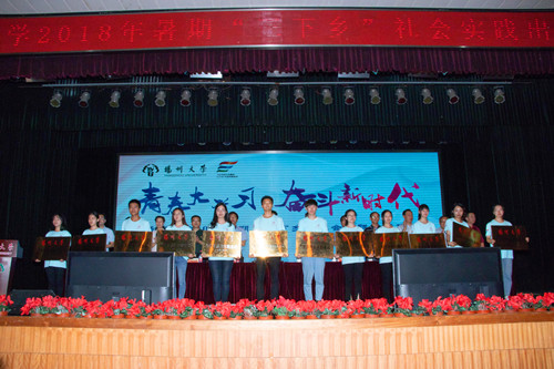 7月13日下午,学校在荷花池校区大学生活动中心三楼小剧场举行2018年暑期“三下乡”社会实践活动出征仪式,全面启动2018年大学生暑期社会实践活动。校党委副书记叶柏森,校党委副书记、副校长刘祖汉出席活动,并为省第十九届运动会志愿者服务团和省第十届园艺博览会志愿者服务团授旗。
