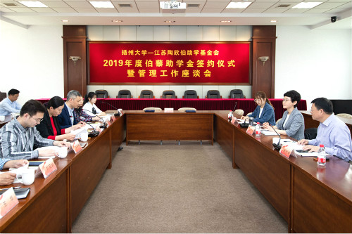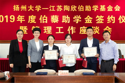 学校举行2019年度伯藜助学金签约仪式暨管理工作座谈会 5月10日,2019年度伯藜助学金签约仪式在荷花池校区行政楼一楼报告厅举行。校基金会理事长陈耀,江苏陶欣伯助学基金会理事长李建伟、秘书长张利伟等出席活动。