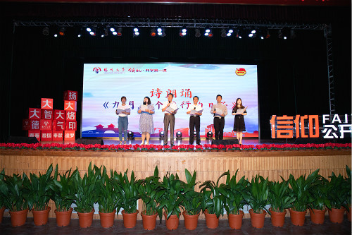 据悉,本次活动结合庆祝新中国成立70周年,以“青春献给祖国”为主题,以“信仰公开课”的形式,积极探索第一二课堂融合推进思想政治引领工作,引导全校青年学生坚定理想信念、矢志爱国荣校。活动由宣传部、教务处、学工部(处)、研工部、团委、关工委、对外联络办、马克思主义学院共同主办。各主办单位负责同志、部分带训教官、2019级新生代表、第12期菁英培训营全体学员等600余人参加活动。扬州发布、云犀等平台对活动进行了直播,累计7000余人收看。