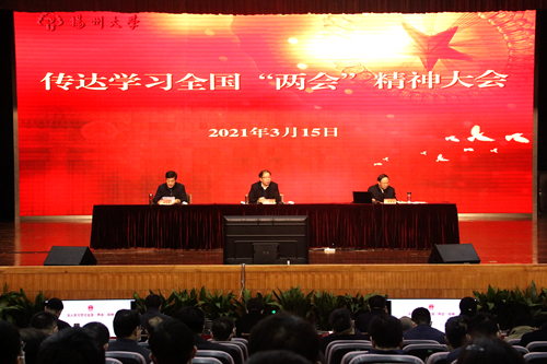 3月15日,学校在荷花池校区大学生活动中心三楼小剧场召开传达学习全国两会精神报告会。第十三届全国人大代表、校长焦新安传达全国两会精神,姚冠新等全体在扬校领导出席会议,校党委副书记叶柏森主持会议。