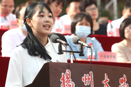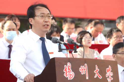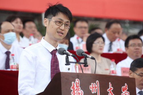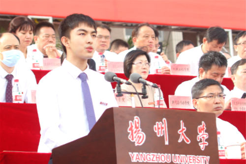 开学典礼上,教师代表、文学院陈军教授,校友代表中国农业科学院中国水稻研究所研究员,博士生导师王克剑,老生代表、校学生会执行主席张程通同学,新生代表、建筑科学与工程学院彭岩同学先后发言。陈军在发言中指出,明德方能致远,日新造就卓越。期待所有新生“继前人之志,尽我人之力,益大益充,传校誉于后世,建大业于寰中”。王克剑在发言中说,未来充满未知,也充满挑战。希望同学们传承和发展扬大坚苦自立的校训精神,孜孜不倦学习、躬身勤勉实践,勇立时代潮头,争做新时代扬大人。张程通与学弟学妹们分享了大学生活的体悟,号召广大新生,在新的起点上,奋笔疾书、探索创新、勇于担当。彭岩代表全体新同学表示,作为新时代的新青年,要立志高远、力学不倦、力行担当,努力成长为大德、大智、大气和有鲜明扬大烙印的有为青年。