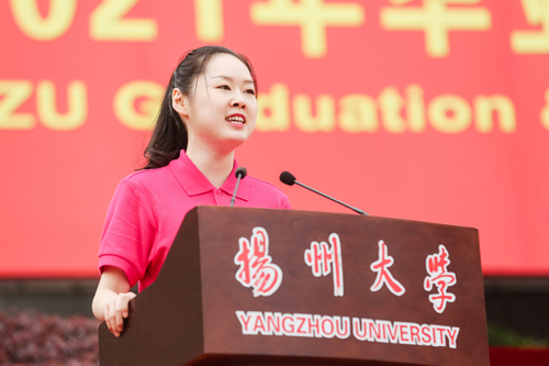 毕业生代表、外国语学院张维珍同学回顾了自己的四年求学生涯,她感恩母校的培养、感谢恩师的教导,并以“此生无悔入扬大,回首仍是扬大人”向母校深情告白。