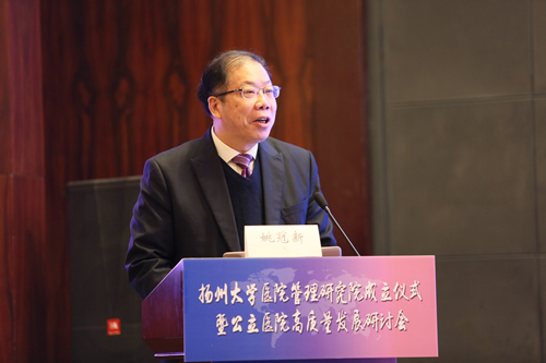姚冠新在致辞中介绍了我校事业发展概况,回顾了我校医学教育发展历史。他表示,医院管理研究院的成立是落实学校医科发展大会精神的重要举措,也是进一步推动我校医科高质量发展的有力抓手。他希望,作为校级研究机构,医院管理研究院要聚焦高标对标抓建设,心无旁骛强内涵,协同发展聚资源。以卓越的品质打造一所创新型、研究型、实践型的医院管理研究院,为健康中国扬州样本建设作出新的更大贡献。学校将全力支持医院管理研究院进一步做大做强做响品牌,为研究院的人才队伍、教学科研等工作开展创造良好的环境。