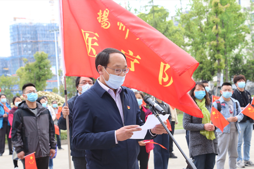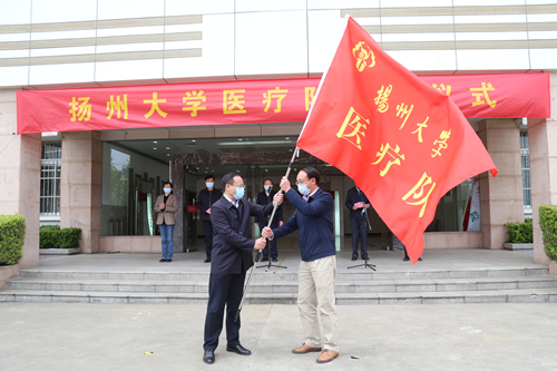 4月15日,在省委省政府统一调度下,我校选派50名具有医学背景的老师、医护人员和相关工作人员支援苏州开展核酸检测工作。当天下午,学校在江阳路北校区举行扬州大学支援苏州疫情防控医疗队出征仪式。校党委书记焦新安出席活动并讲话,校长丁建宁为出征医疗队授旗,活动由副校长洪涛主持,叶柏森、周琴、周如军等校领导参加活动。