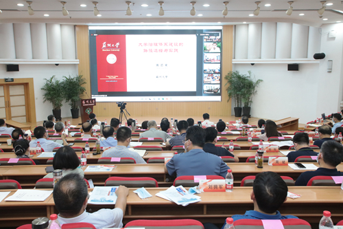 苏州大学原校长熊思东应邀作了题为《大学治理体系建设的路径选择与实践》的专题报告。熊思东详细阐述了大学治理的内涵、中国大学治理的基本原则、建构基础,并结合苏州大学的实践经验,系统阐明了地方大学发展的整体概况、发展过程中的机遇和挑战。他强调,地方高校要始终坚守初心,打破传统束缚,以创新的勇气担当使命和重任,推动高等教育内涵式高质量发展。