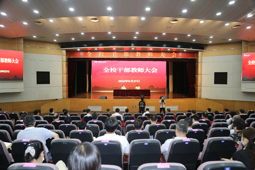 8月27日,学校在荷花池校区大学生活动中心三楼小剧场召开2022-2023学年秋季学期全校干部教师大会。大会总结了上半年工作成效,部署了新学期工作,号召全校教职工保持定力、接续发力、激扬活力,全力以赴高质量做好下半年各项工作,以实际行动迎接党的二十大和学校第四次党代会胜利召开。校党委书记焦新安主持会议并讲话。校长丁建宁作工作报告。全体校领导、党委常委出席会议。
