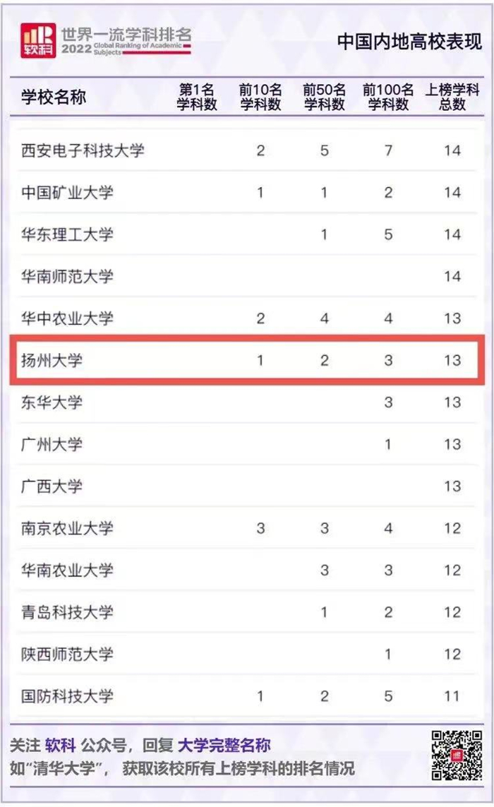 出台《扬州大学一流学科创建重点工作实施方案(试行)》,以学科集群创建一流学科,优势特色学科建设和新一轮学科评估取得历史性突破。通过省优势学科三期项目结项验收,2个学科获评“优秀”等次。获批“十四五”省重点学科10个。对应调整学位授权点4个,新增“储能科学与工程”自设交叉学科。17个学科入选“USNEWS 2023世界大学学科排名”,其中3个学科进入世界前100强。13个学科入选“软科2022世界一流学科排名”,37个学科入选“软科2022中国最好学科排名”,总上榜数位居全国第22。学校在“软科中国大学农科实力评级”榜单中获评A+,位居全国第6。完成第五届学术委员会换届,增设学科交叉专门委员会。