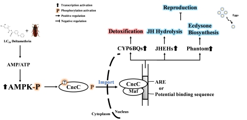 腺苷酸激活蛋白激酶AMPK作为关键的细胞能量感受蛋白,通过抑制合成代谢过程和激活分解代谢过程来调控细胞能量代谢。昆虫Cap ‘n’ collar isoform-C(CncC)是响应外源化合物胁迫的重要转录因子,参与调控解毒代谢相关基因的表达。本研究以赤拟谷盗为模式昆虫,发现溴氰菊酯诱导的氧化胁迫可以激活AMPK,AMPK通过磷酸化促进CncC入核,导致解毒代谢相关基因的上调表达以及调控生殖的激素水平失衡,表明多效性AMPK-CncC信号通路介导了赤拟谷盗解毒代谢与生殖权衡。该研究为从能量分配权衡角度全面认识整个动物界外源化合物及其产生的氧化应激影响生殖的内在机制做出了突出的贡献。
