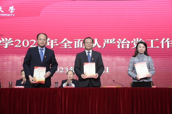 丁建宁在主持会议时强调,全校各级党组织、全体党员要始终保持全面从严治党永远在路上的政治清醒,进一步提高政治站位,坚决落实全面从严治党新要求,切实把思想和行动统一到校党委全面从严治党的部署要求上来,把会议精神转化为坚定理想信念、锤炼党性、忠诚履职的思想自觉和实际行动,切实扛起管党治党政治责任,凝心聚力向着新的奋斗目标再出发,奋力开创全面从严治党新局面。要切实增强履行全面从严治党主体责任的思想意识,坚持以问题为导向,始终把管党治党作为最根本的政治责任,以更加坚韧的定力纵深推进全面从严治党,将各项责任清单落到实处,层层压实全面从严治党责任,保证责任落地、任务见效,奋力推进学校事业发展迈上新台阶。要勠力同心实现全面从严治党的目标任务,牢牢把握 “聚焦‘双一流’、改革再奋进、推动新实践”的年度工作总基调,把全面从严治党与学习贯彻党的二十大精神、推动学校内涵建设高质量发展结合起来,围绕校第四次党代会确立的目标任务、年度党政重点工作等切实强化纪律要求,切实以全面从严治党的新成效,为谱写高水平研究型大学建设现代化新篇章保驾护航作出新的更大贡献。
