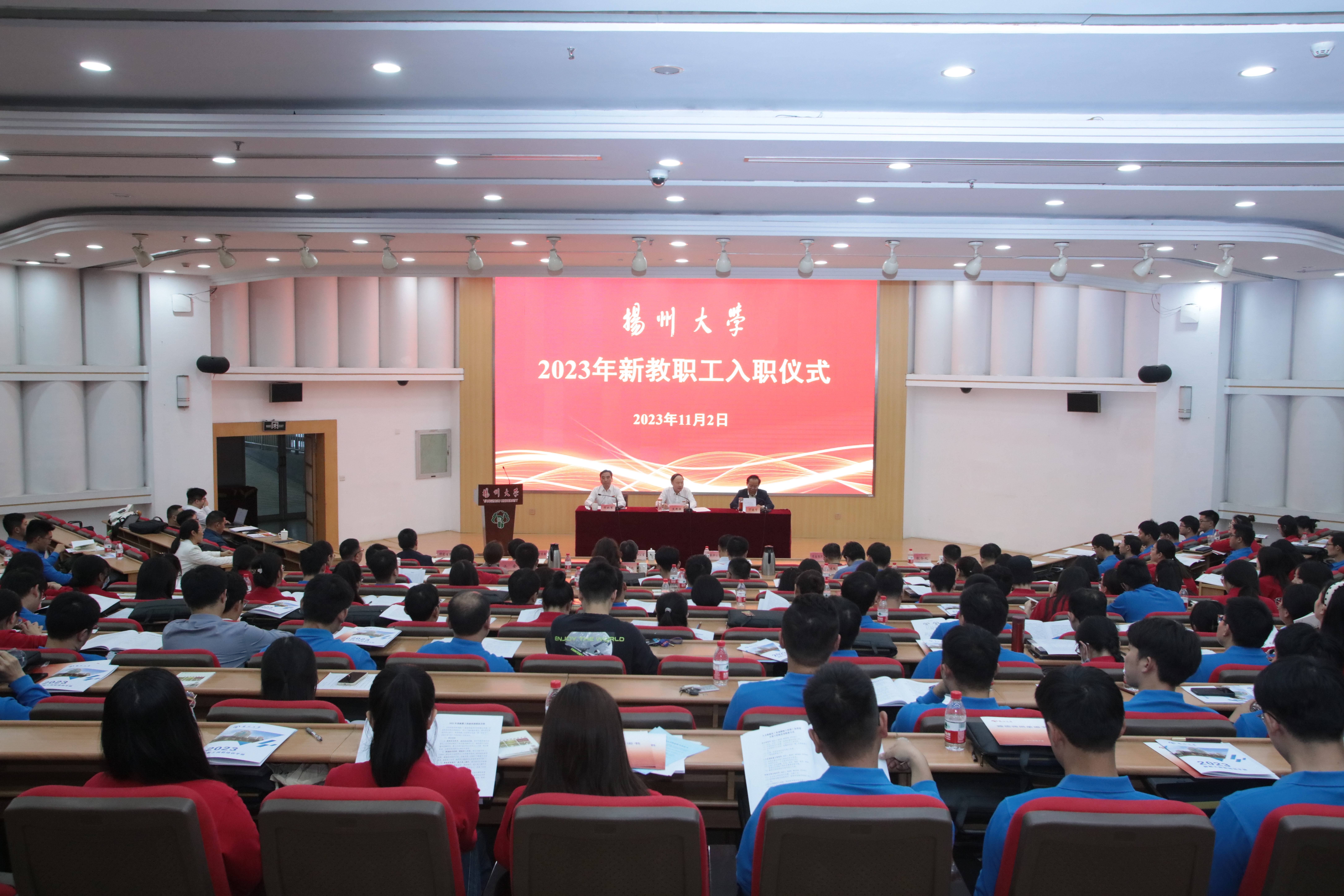 11月2日,学校在荷花池校区逸夫图书馆报告厅举行2023年新教职工入职仪式暨岗前培训主题报告会。校党委书记焦新安出席会议并讲话,校长丁建宁为全体新入职教职工作岗前培训主题报告。校党委副书记周如军主持会议。