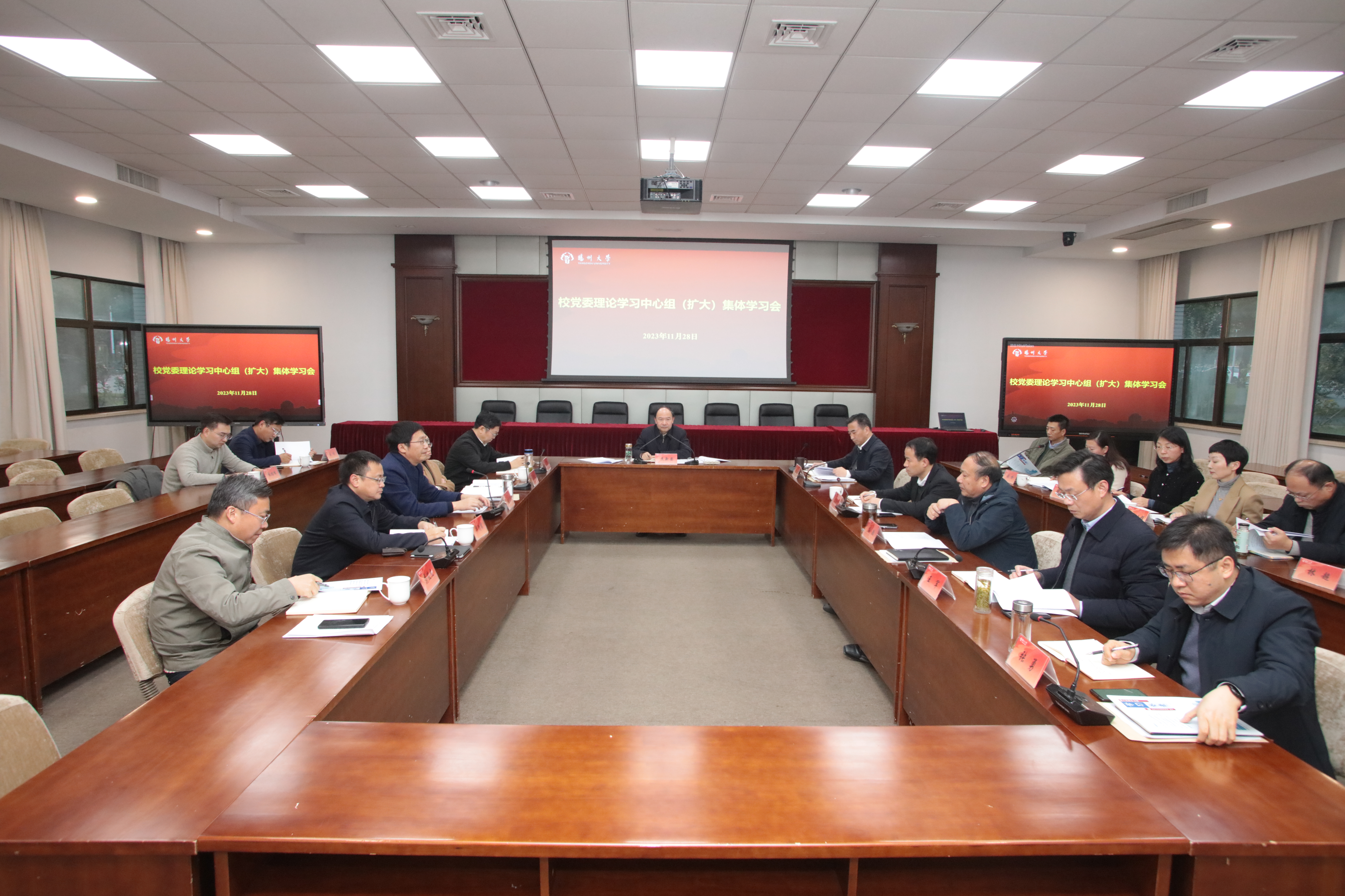 11月28日,学校在荷花池校区行政楼一楼报告厅召开党委理论学习中心组(扩大)集体学习会,专题学习习近平文化思想。校党委书记焦新安主持会议并讲话。周如军、蒋乃华、龚卫娟、王承堂等在扬校领导及中心组其他成员参加学习。