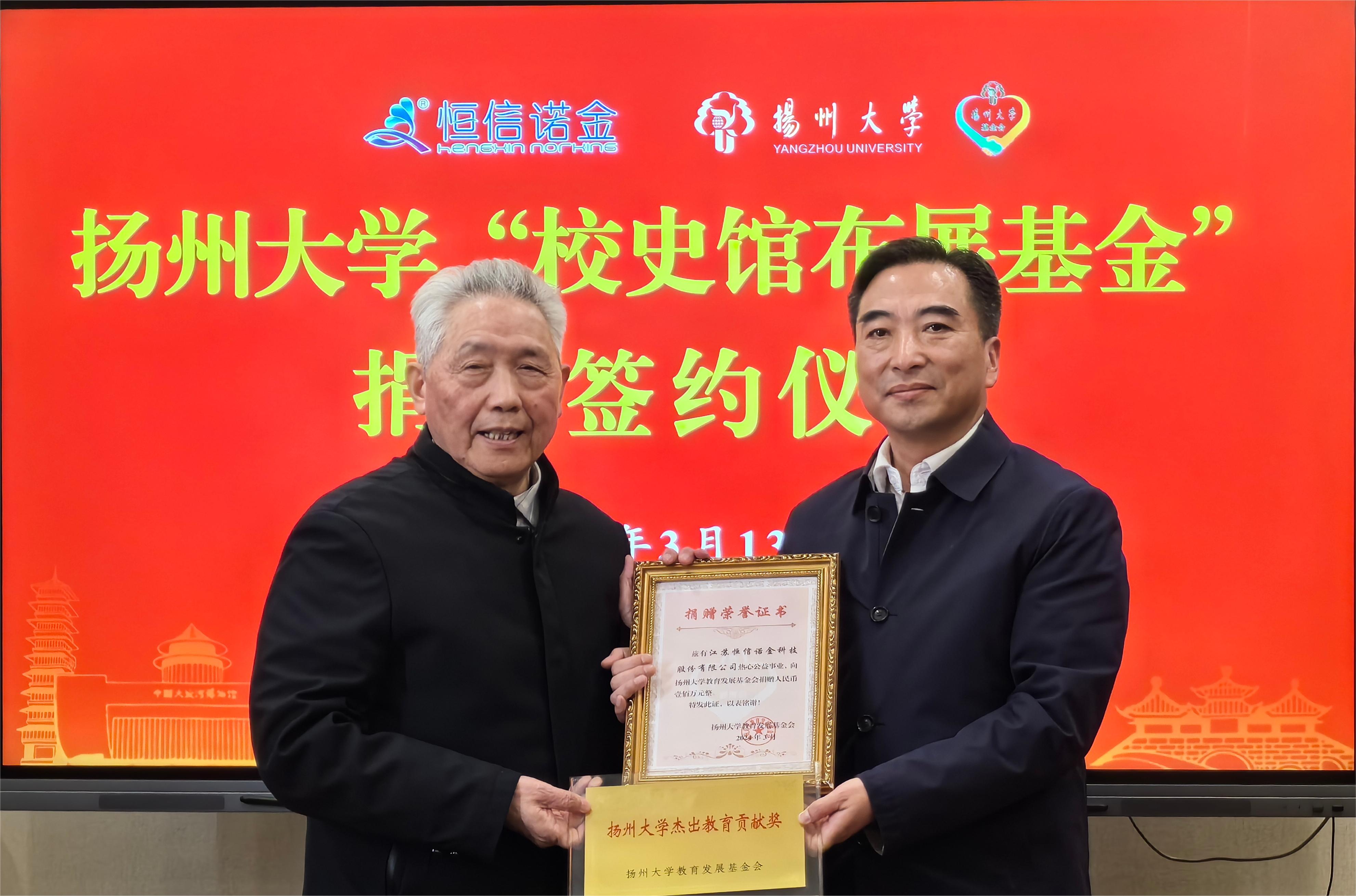 3月13日,扬州大学“校史馆布展基金”捐赠签约仪式在校友馆举行。江苏恒信诺金科技股份有限公司董事长,我校植保专业1975届校友朱延文代表公司向学校捐资100万元,用于支持校史馆布展工作。校党委书记焦新安,校党委副书记周如军,校党委原副书记梁隆圣,扬大教育发展基金会理事长、校友会副会长陈耀等出席仪式。