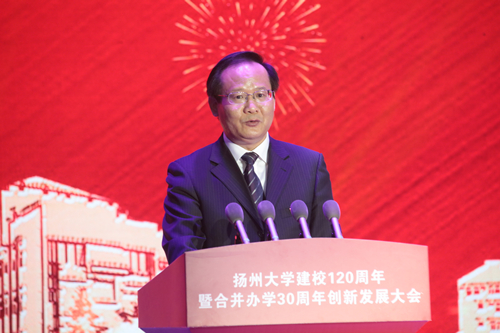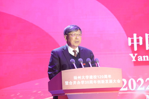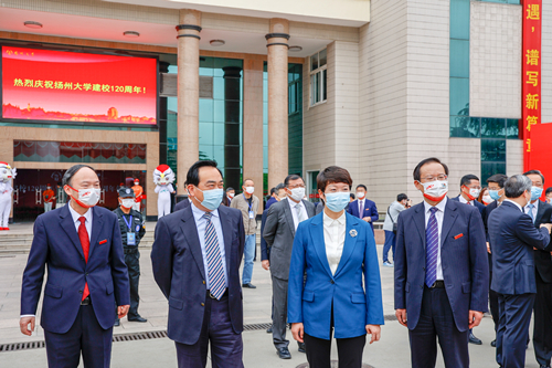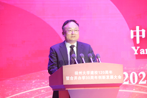 吴政隆强调,教育是对中华民族伟大复兴具有决定性意义的事业。希望扬州大学以建校120周年为新的起点,深入学习贯彻习近平总书记关于教育的重要论述,聚焦立德树人根本任务,弘扬优良办学传统,加快建设国内一流、国际知名、特色鲜明的高水平研究型大学,为党和人民培养堪当民族复兴重任的时代新人,培养德智体美劳全面发展的社会主义建设者和接班人。要胸怀“两个大局”,牢记“国之大者”,充分发挥学校学科优势,在推进科技自立自强、种业振兴、卫生健康、大运河文化建设等方面展现更大作为,为全省扛起“争当表率、争做示范、走在前列”光荣使命、谱写“强富美高”新江苏现代化建设新篇章作出新的更大贡献。