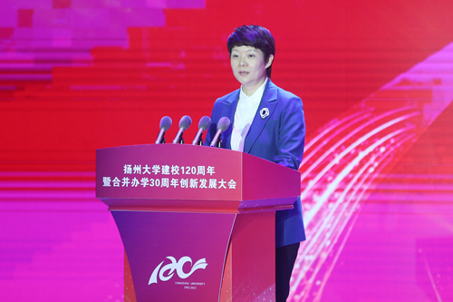 张宝娟代表市委、市人大、市政府和市政协向扬州大学建校120周年、在扬办学70周年、合并办学30周年表示祝贺。她表示,名城滋养名校,名校成就名城。近年来,双方坚持互利共赢理念,持续深化校地合作,致力打造校地融合发展共同体,共同实施了一批标志性项目,干部双向交流、人才共同培养成效显著,校地合作渐入佳境。新一轮名城名校合作共建协议的签署,既是为扬州大学献上一份沉甸甸的生日“贺礼”,也是为进一步打造校地合作典范许下一个诚挚“约定”。张宝娟表示,我们将继续与扬大同呼吸、共命运,一如既往地举全市之力支持扬大改革发展、助力扬大学子成长成才,合力谱写“好地方”滋养“好大学”、“好大学”支撑“好地方”的“强富美高”新扬州现代化建设新篇章。衷心期盼扬州大学站在新的历史起点,加快“双一流”创建,助力“好地方”发展,在“三个名城”建设中当好领头羊、续写新辉煌;真诚希望所有扬大同仁与我们携手共进,开展更多高水平合作,力促更多成果呈现,实现双方资源最优化整合、优势最大化发挥;诚挚期望每位扬大学子身心安处是故乡,进一步了解扬州、热爱扬州、融入扬州、扎根扬州,在“好地方”创造好生活、成就好事业。