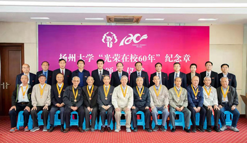 现场,建校120周年主题宣传片《求索》带领大家重温了扬州大学教育报国、弘道树人的百廿征程。“光荣在校60年”纪念章颁发仪式视频短片,呈现了从少年到白头的扬大人爱校荣校的感人画面。为了向历史致敬、向前辈看齐,今年学校共为329名老同志颁发“光荣在校60年”纪念章,并将从今年起每年为在校学习、工作、生活满60年的老同志颁发纪念章。
