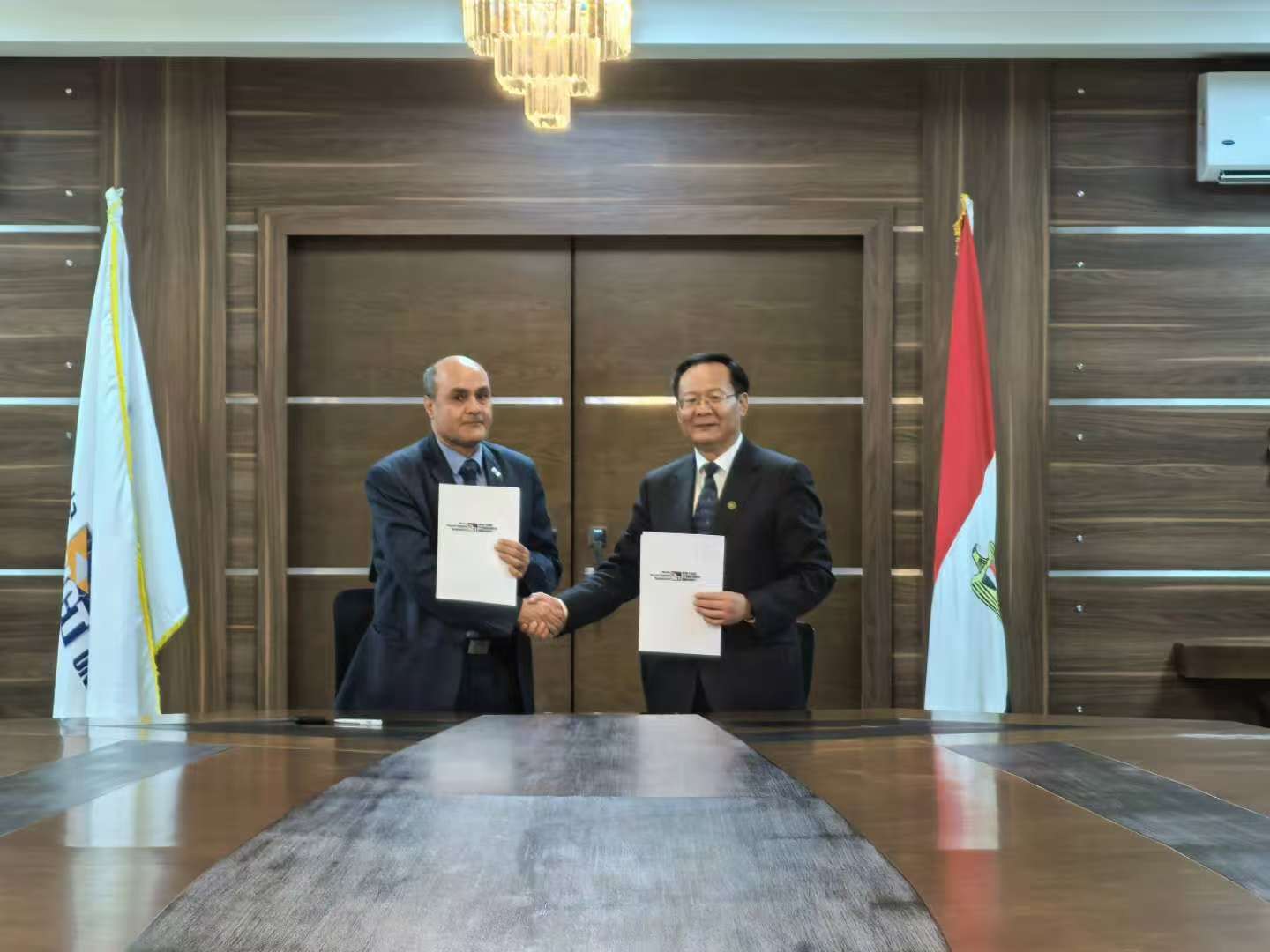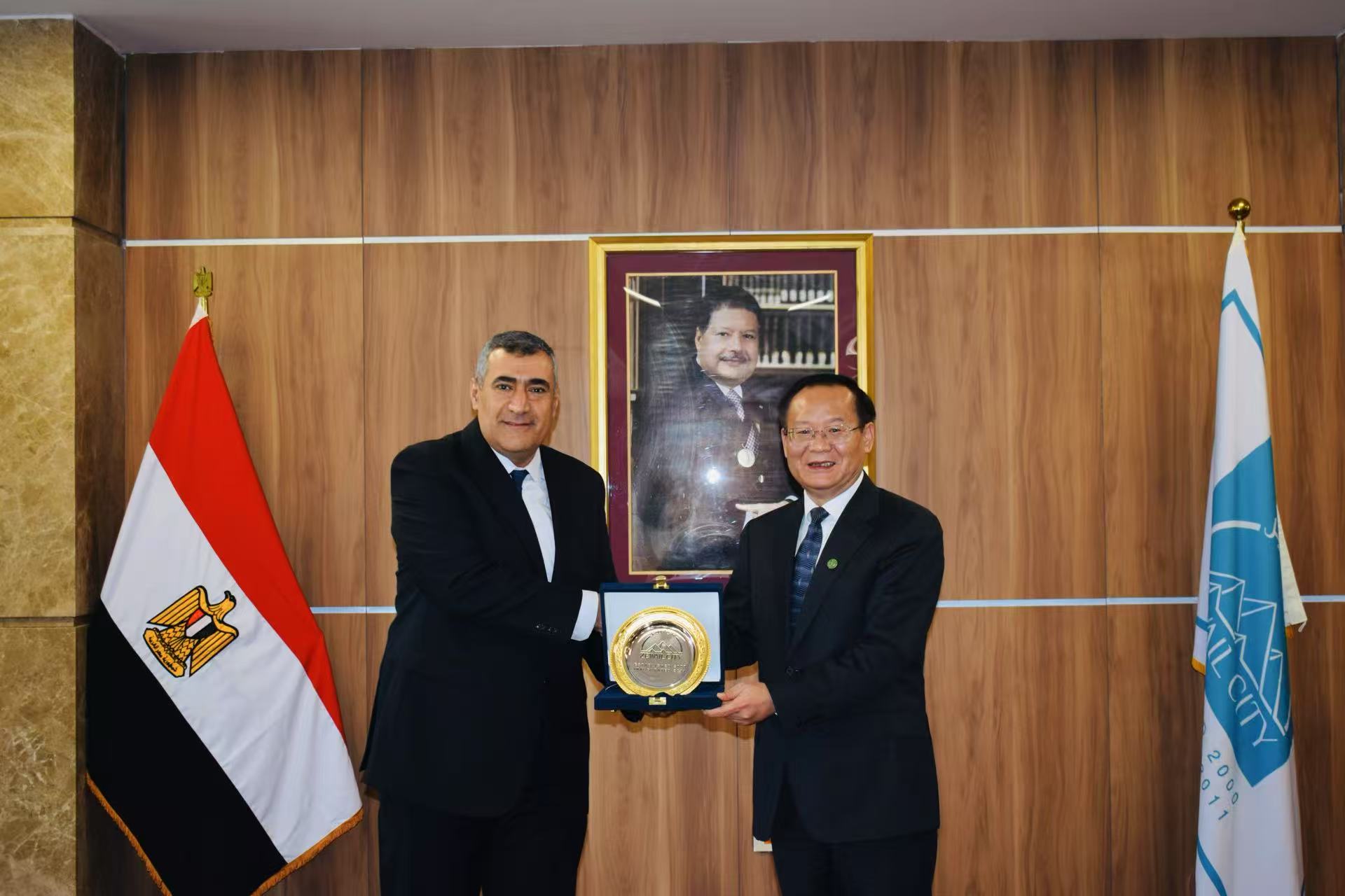 在新开罗技术大学,代表团围绕国际合作与交流、留学生招收、人才培养情况等方面进行了交流。该校校长Tarek Abdel Malak Mikhail重点介绍了该校办学历史、发展概况,以及在机电工程、自动化、能源工程、信息工程等方面的特色,并表达了明确的合作意向。丁建宁表示,希望双方在留学生教育、国际科研项目合作等方面进一步加强合作。会谈后,丁建宁与Tarek Abdel Malak Mikhail签署了合作意向书。