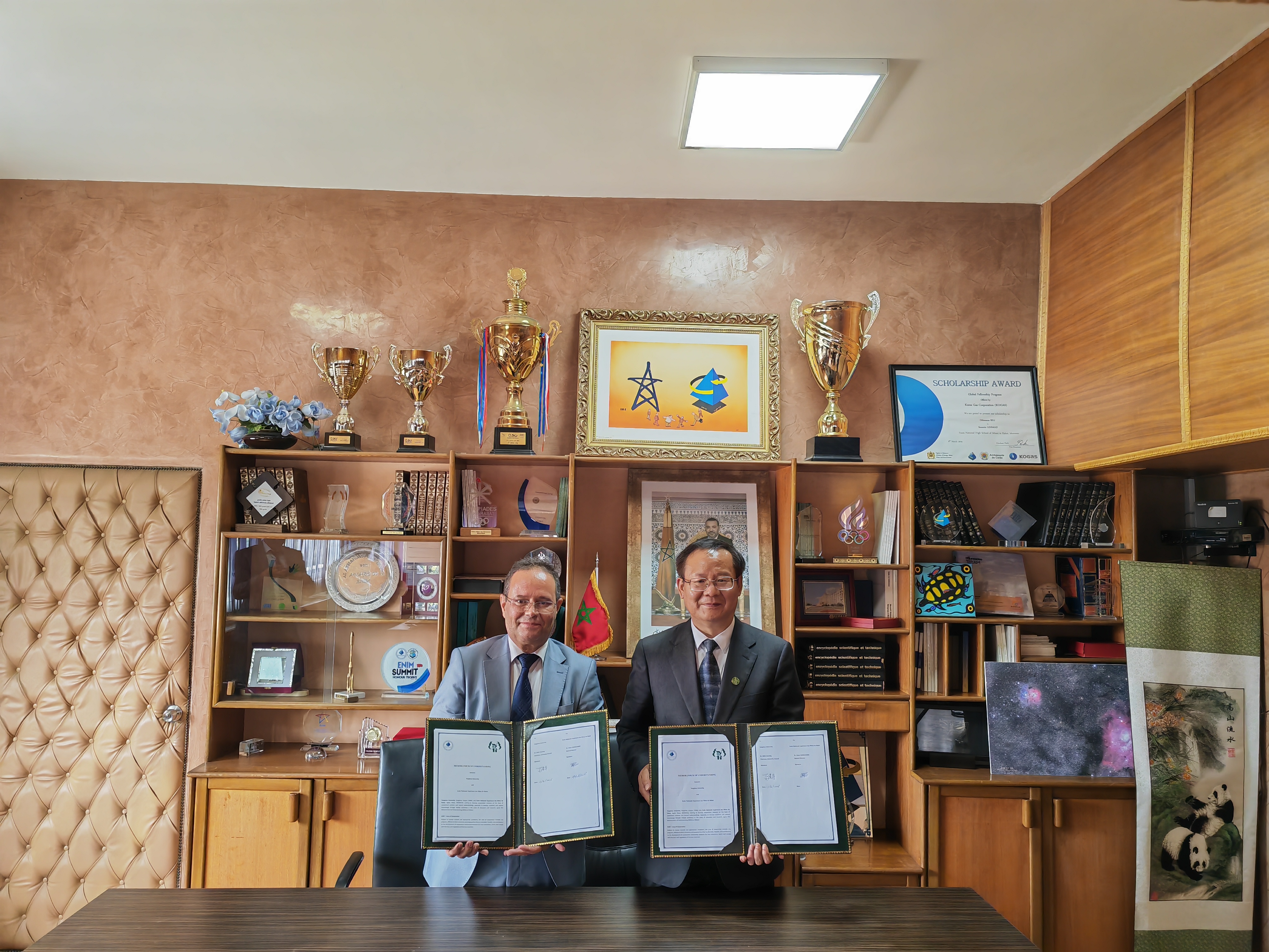 在摩洛哥国立拉巴特高等矿业学校,丁建宁介绍了我校的发展情况和对外合作情况,特别是在新能源领域的研究进展及“中非大学联盟”交流机制。该校校长Omar Oussouaddi对代表团的到访表示热烈欢迎,介绍了该校的办学历史和研究方向布局,并表示,希望进一步深化科研合作和加强留学生教育。会谈后双方签署了合作协议。