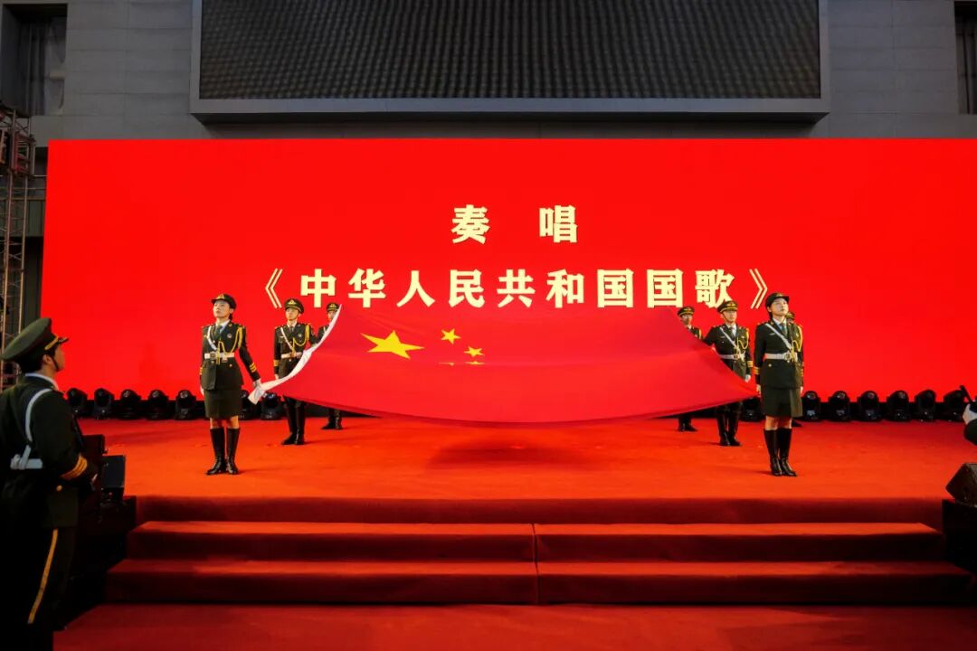 典礼在歌曲联唱、暖场视频中热力启幕。伴随着铿锵的脚步,国旗护卫队队员手捧国旗整齐入场。现场展示的这面国旗具有特殊意义,系学校于2024年获赠的校庆日当天(5月19日)在天安门广场升挂的国旗。活动中,9000余名师生面向国旗庄严肃立、行注目礼。在激昂的国歌声中,全体师生齐声表达了对祖国的深切热爱,浓浓的爱国情在会场上空激荡回响。