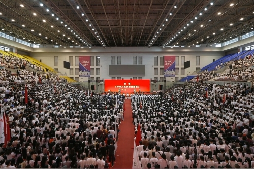 在庄严的国歌声中,开学典礼拉开了序幕。伴随着铿锵的脚步,国旗护卫队队员手捧国旗整齐入场,现场展示了学校于2024年获赠的校庆日当天(5月19日)在天安门广场升挂的国旗。5000余名师生面向国旗庄严肃立、行注目礼。在《歌唱祖国》的悠扬韵律中,全体师生高高挥舞着“中国红”,用歌声礼赞祖国。