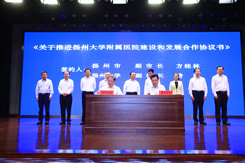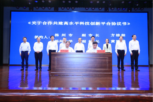 洪流、夏心旻代表省教育厅和扬州市人民政府签署了《江苏省教育厅、扬州市人民政府共建扬州大学协议书》;夏心旻、焦新安代表市校双方签署了《扬州市人民政府、扬州大学进一步全面深化合作协议书》;扬州市委常委、宣传部部长勾凤诚,我校党委副书记叶柏森代表市校双方签署了《关于合作共建扬州高端智库协议书》;扬州市副市长方桂林、我校副校长费坚代表市校双方签署了《关于推进扬州大学附属医院建设和发展合作协议书》;方桂林、我校副校长黄建晔代表市校双方签署了《关于合作共建高水平科技创新平台协议书》。