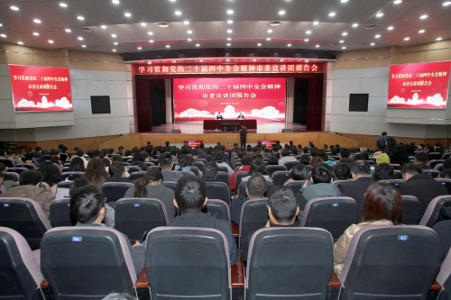 11月27日,学习贯彻党的二十届四中全会精神市委宣讲团报告会在荷花池校区大学生活动中心小剧场举行。扬州市委宣讲团成员、我校马克思主义学院教授胡立法作专题辅导报告。校党委书记丁建宁主持报告会。