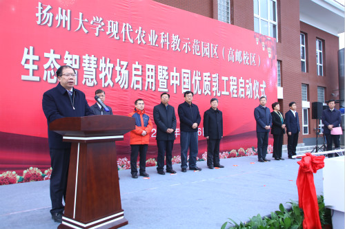 姚冠新在讲话中回顾了市校合作的重要节点和重大成果。他指出,扬大与扬州的市校合作是全省市校合作的重要典范和样本,双方已进入历史上最好的合作期和共赢期。生态智慧牧场的正式投入启用,表明扬州国家农业科技园区的建设核心已成功落子,标志着我校高邮园区的建设发展取得了关键性突破,也意味着扬大康源乳业有限公司迎来了历史性的发展机遇。姚冠新表示,学校将大力推进科教示范园区建设,尽快把示范园区建设成为具有国际视野、体现中国水平、突出区域特色的现代农业科教示范园区,努力将其打造成为国际先进、国内一流的现代农业科技创新示范基地、农业科技国际合作试验示范基地和农业科技创新成果转化基地。