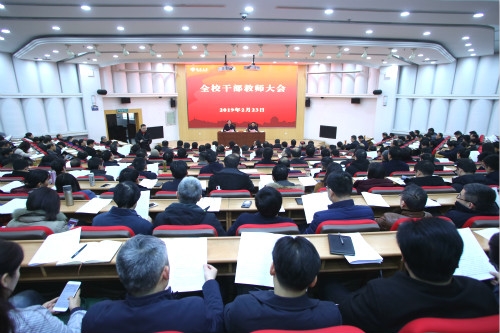 2月23日下午,学校在荷花池校区逸夫图书馆报告厅召开全校干部教师大会。校党委书记姚冠新主持会议并讲话。校长焦新安总结2018年工作,部署2019年主要工作。全体校领导出席会议。