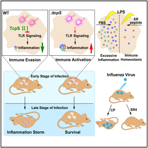 该研究团队在沙门菌中鉴定了含有Coiled-coil和TIR结构域的基因tcpS,确定了肠炎沙门菌可通过T3SS1分泌TcpS蛋白。TcpS通过模拟TLRs的TIR结构域干扰TLR-NFκB信号通路,抑制p65的入核以及炎性细胞因子的分泌,从而逃逸天然免疫应答。另外,肠炎沙门菌在感染早期抑制炎症反应,促进其在体内的增殖,最终导致其在感染后期引起血液中炎性风暴,造成组织病理损伤。TcpS通过N端的Coiled-coil结构域形成同源二聚体,是TcpS发挥高效抑炎作用所必需的。该研究还进一步确定了TIR-TcpS多肽可抑制LPS诱导的炎性因子的产生、 p-ERK和p-JNK的活化、降低小鼠血清中炎性反应和血红蛋白的释放。SR4多肽在H1N1流感病毒攻毒模型中对小鼠具有良好的保护效应,进一步确定了TcpS蛋白中关键的功能性肽段,其可作为过度炎性反应或自身免疫性疾病的潜在治疗药物。本研究揭示了肠炎沙门菌逃逸机体天然免疫的新机制,亦为沙门菌减毒活疫苗和新型抑炎小分子药物的设计提供了新思路。