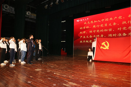 党课开始前,举行了重温入党誓词仪式。姚冠新带领全体党员师生面向党旗,举起右拳,庄严宣誓,重温入党誓词。