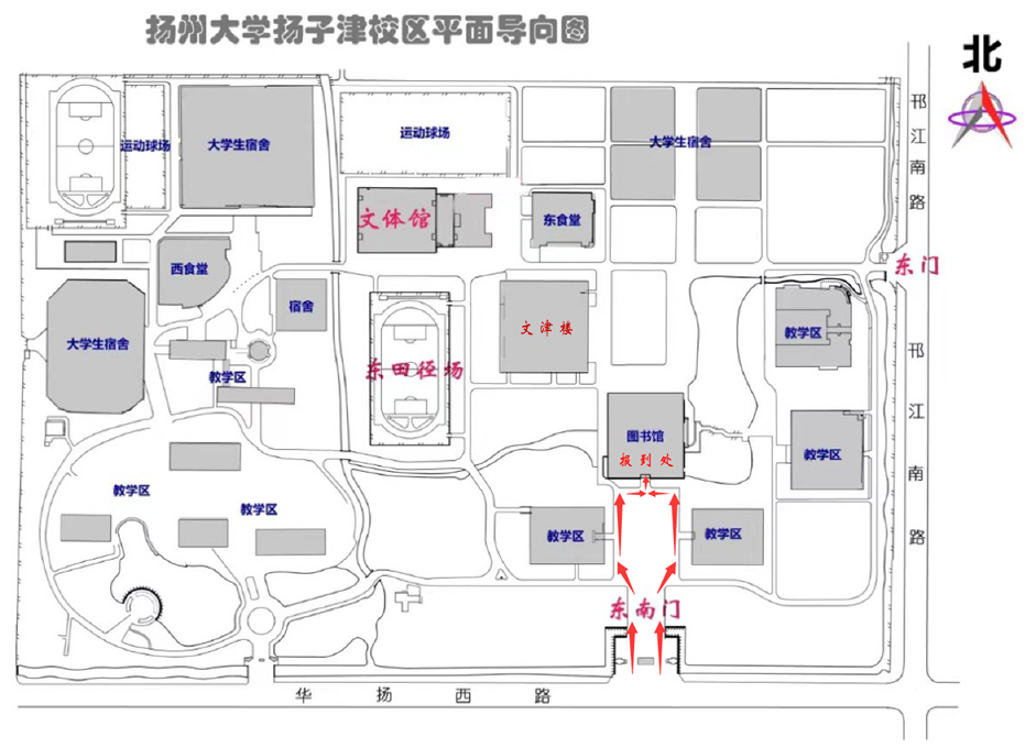 (2)报到期间,考生接送车辆可从扬子津校区华扬西路196号东南门进出校园,车辆停放应服从校区保卫人员安排,保证道路畅通。校内车辆限流时,请将车沿华扬西路两侧按交警要求,有序停放。
