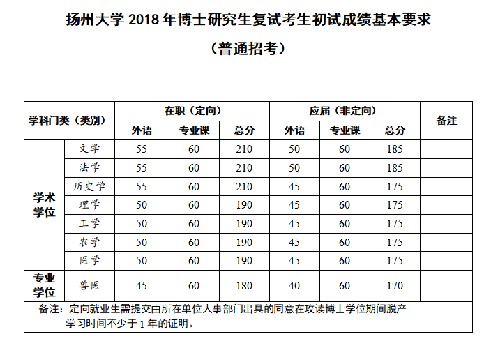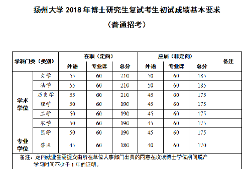 1.各学院根据《扬州大学2018年博士研究生复试考生初试成绩基本要求(普通招考)》(以下简称分数线),结合本学院博士研究生招生计划及生源情况,不低于分数线要求基础上,确定招生学科复试考生试成绩要求。根据定向就业生非定向就业生招生计划,可分确定复试考生名单。
